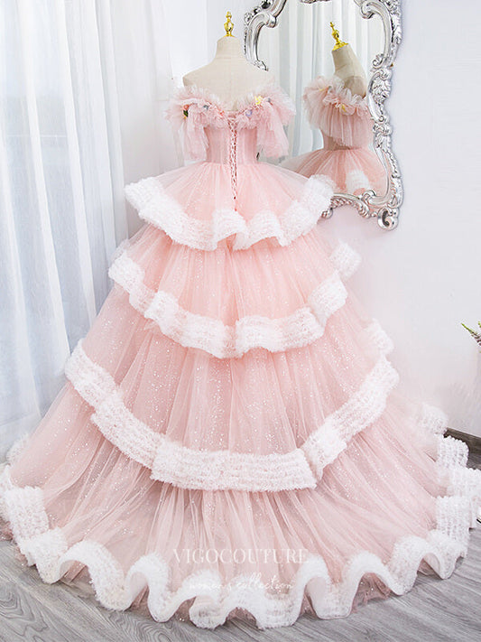 Blush Tiered Lace Applique Sweet 16 Dresses Off the Shoulder Ball Gown 20472