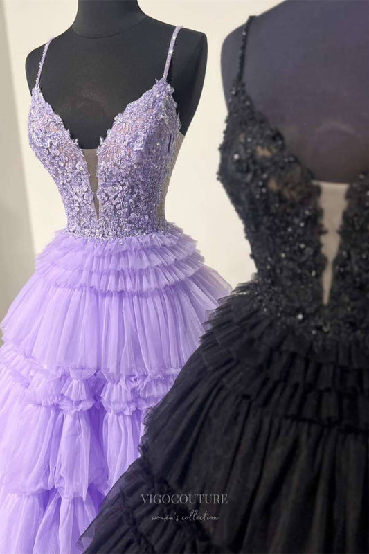 Lace Applique Tiered Ruffled Prom Dresses Spaghetti Strap Plunging V-Neck 24337