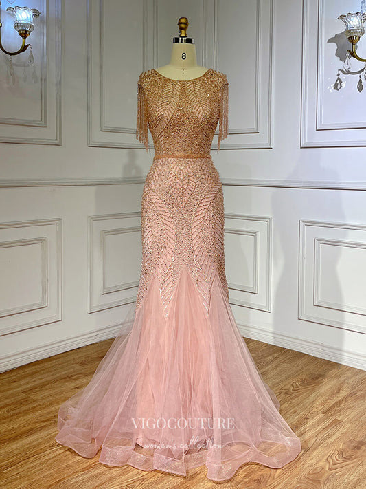 Pink Beaded Prom Dresses Puffed Sleeve Sparkly Tulle Princess Dresses 22078