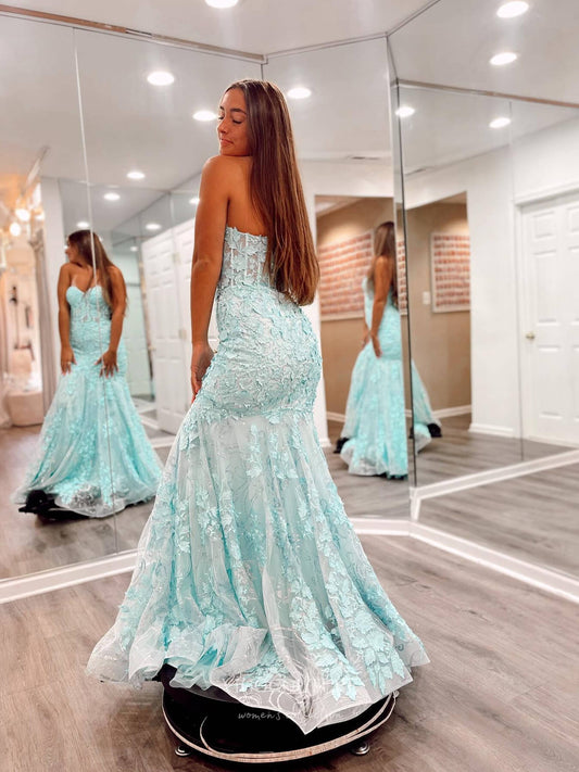 Aqua Lace Mermaid Prom Dresses with Sweetheart Neckline & Sheer Boned Bodice - 24065