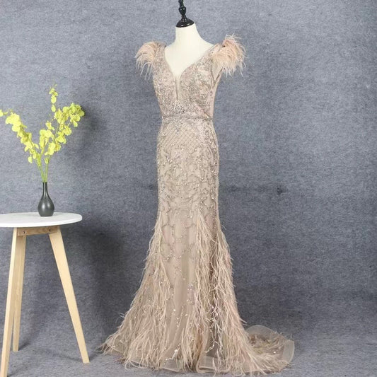 Beaded Feather Formal Dresses Short Sleeve Prom Dress 21622