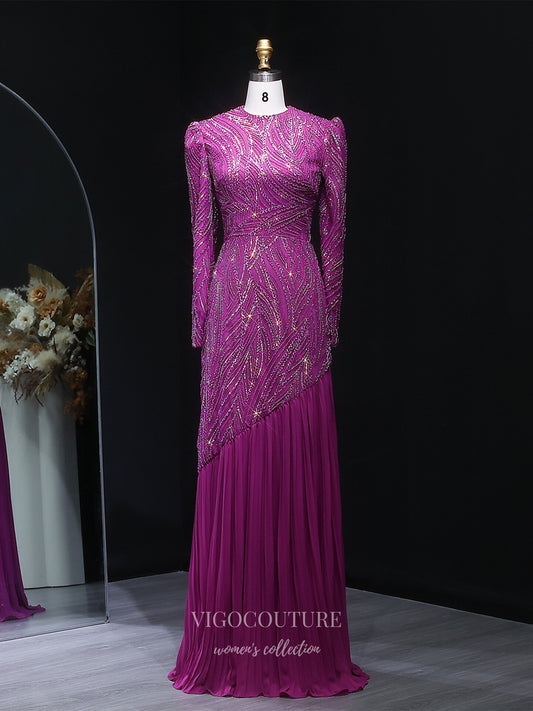 Purple Beaded Long Sleeve Evening Gown with Round Neck, Asymmetrical Beading & Pleated Chiffon Skirt – 26021