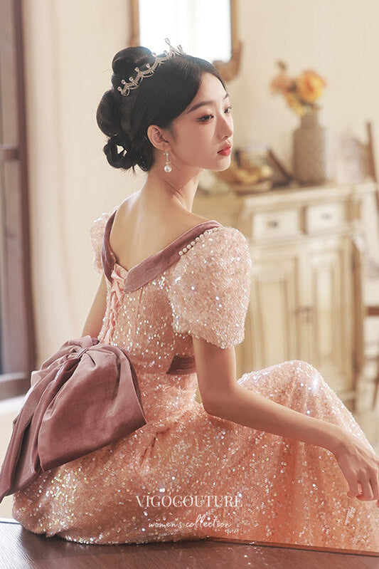 Blush Sparkly Tulle Formal Dress Short Sleeve Prom Dresses 21638