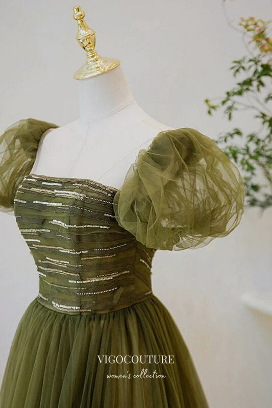 Olive Green Puffed Sleeve Formal Dress A-Line Tulle Prom Dresses 21639