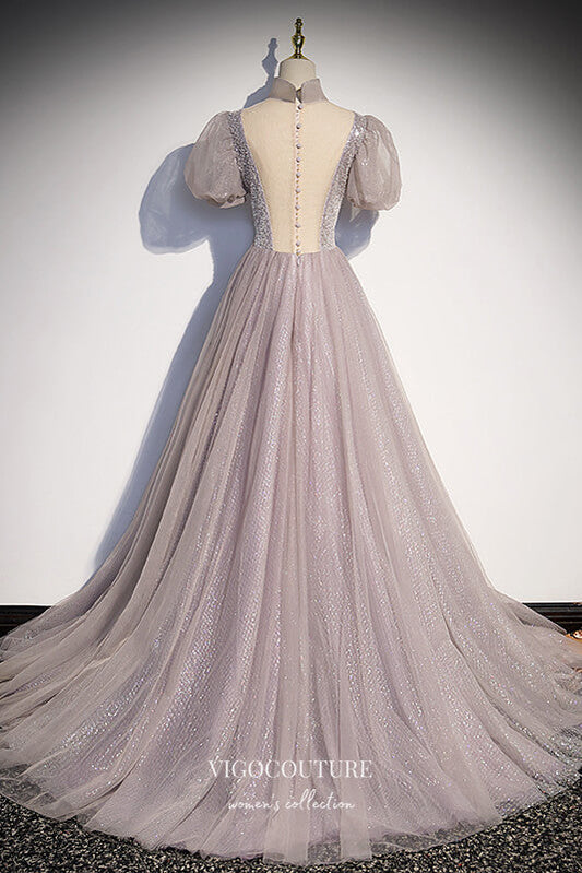 Sparkly Tulle Puffed Sleeve Formal Dress A-Line Beaded Prom Dresses 21644