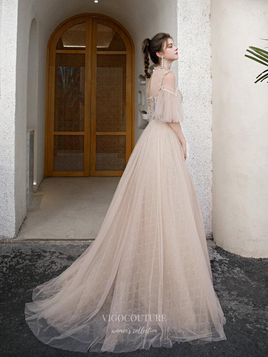 Blush Tulle Prom Dress with Embroidered Corset and Sheer Sleeves - 20245