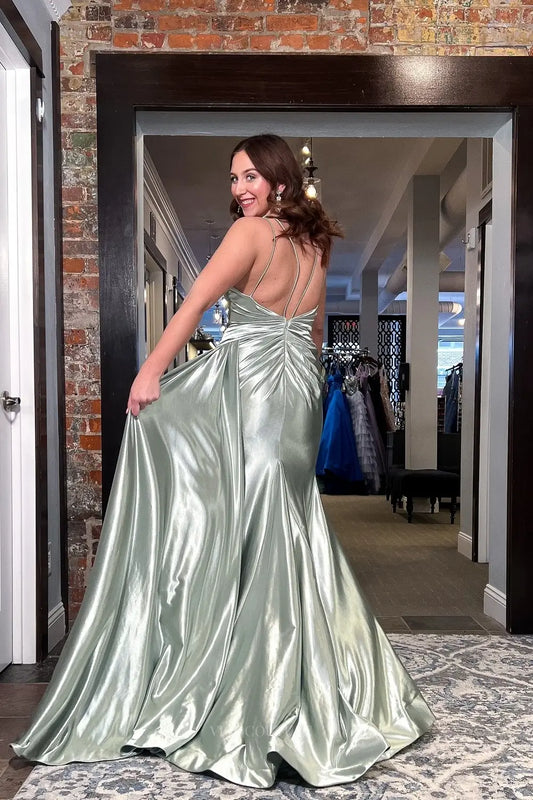Sage Green Satin Mermaid Prom Dress with Corset Bodice, Spaghetti Straps & High Slit – 26074