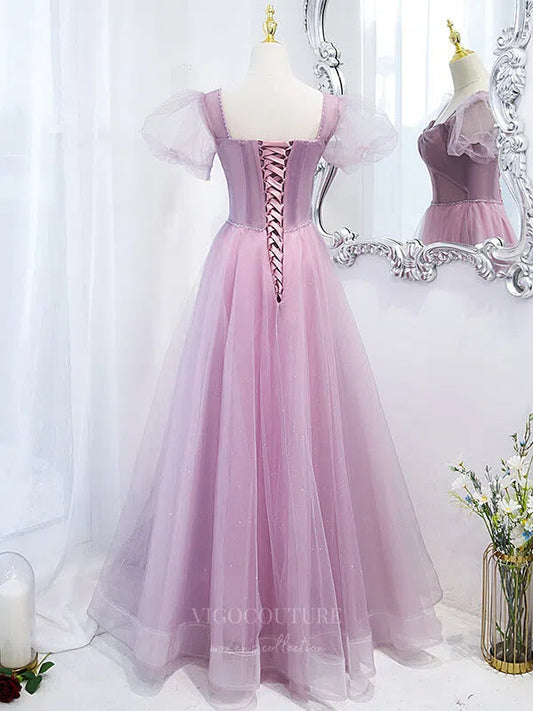 Pink Tulle Puffed Sleeve Sweetheart Neck Prom Dress 20874