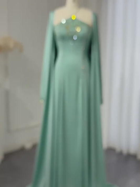 Mint Green Beaded Halter Neck Sheath Evening Gown with Cape Sleeves & Embroidered Bodice – 26026
