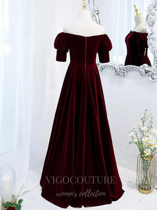 Dark Red Velvet Short Sleeve Prom Dress 2022 Off the Shoulder Formal Dress 20501