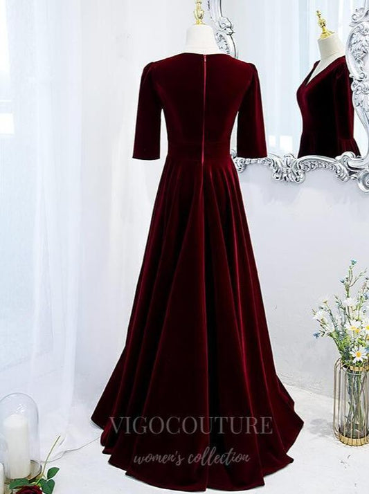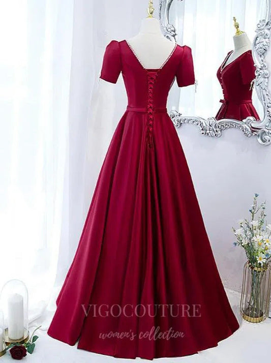 Dark Red Velvet Short Sleeve Prom Dress 2022 V-Neck Formal Dress 20500