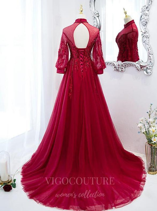 Red Long Sleeve Prom Dress 2022 Beaded High Neck Formal Dress 20503
