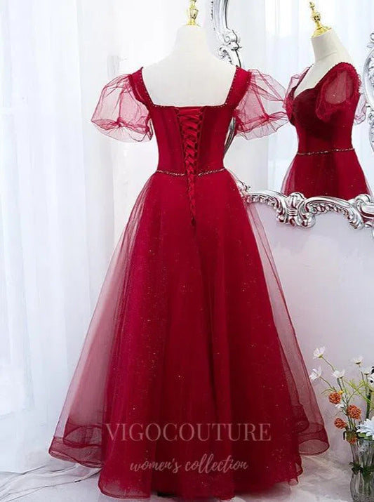 Red Short Sleeve Prom Dress 2022 Suqare Neck Formal Dress 20498