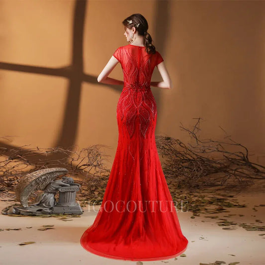 Silver Mermaid Mock Neck Prom Dresses Short Sleeve Beaded Evening Dresses 20072