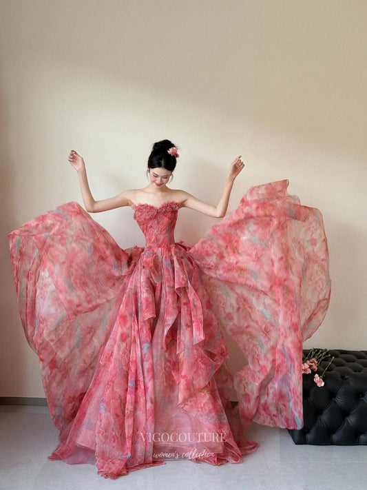 Romantic Red Floral Ball Gown with Strapless Bodice and Layered Organza Skirt – F002
