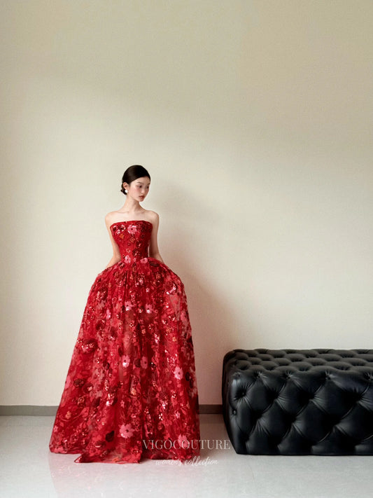 Strapless Red Floral Sequin Ball Gown with Embroidered Tulle Skirt – F006