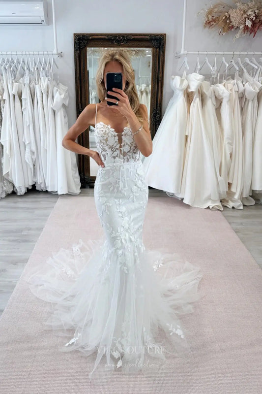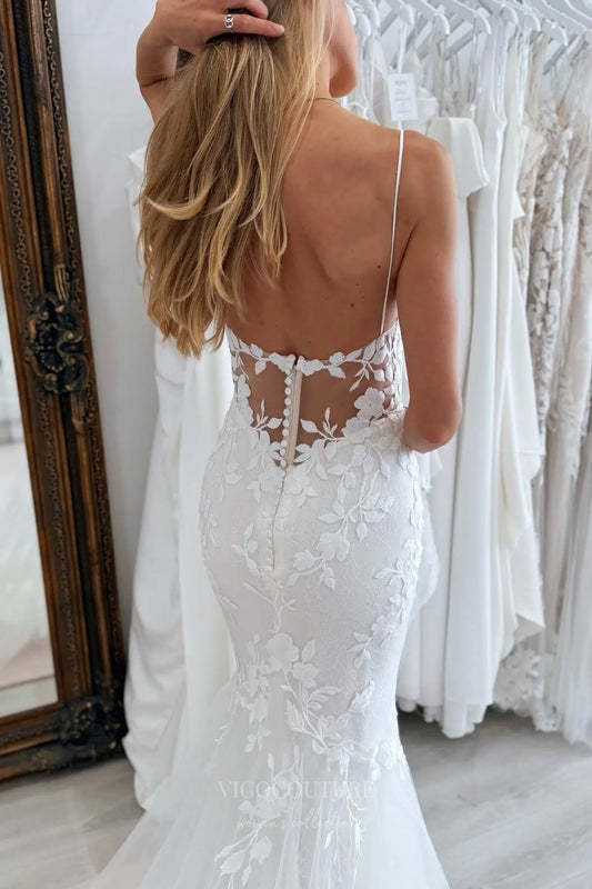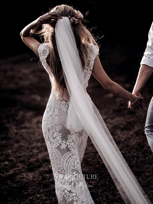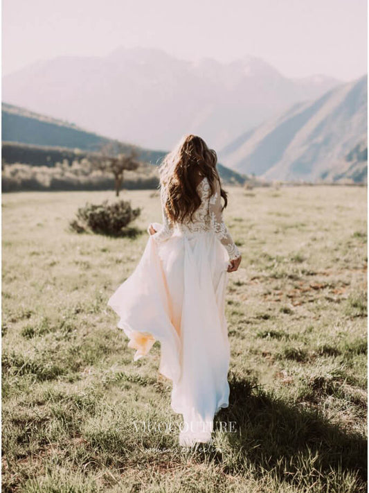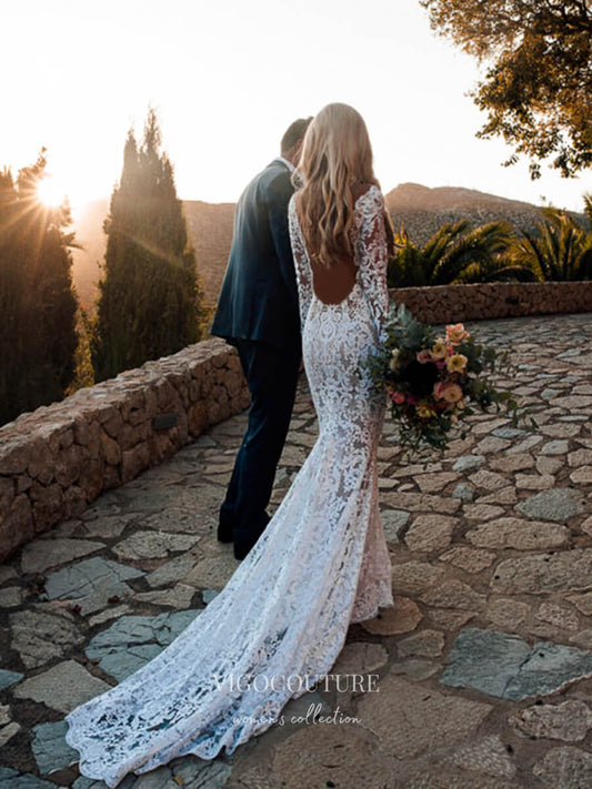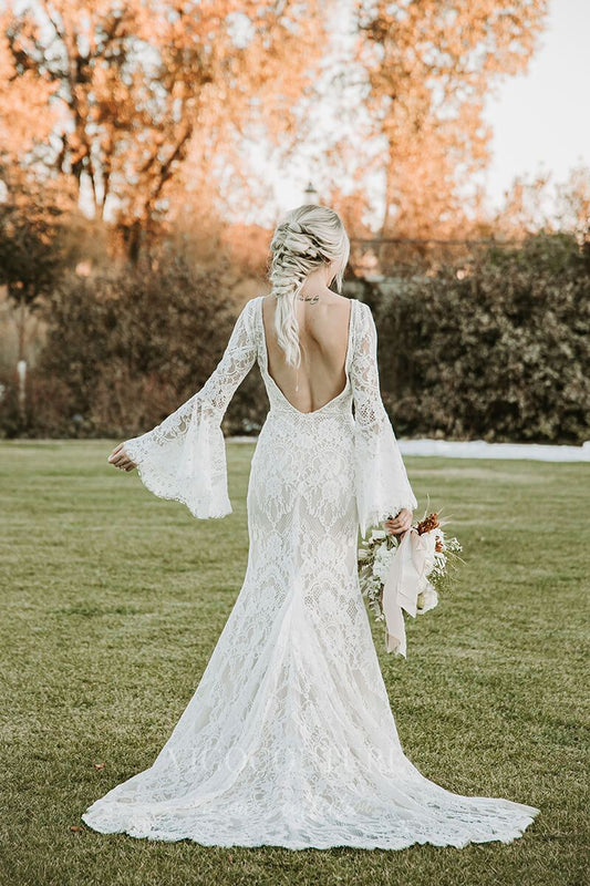 Boho Lace Mermaid Wedding Dresses with Long Sleeves, V-Neck & Open Back - W0018