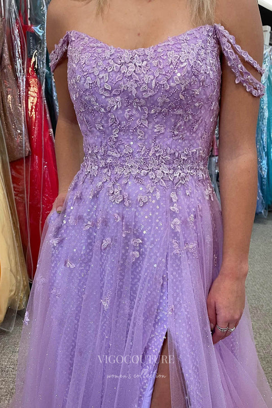 Vestido de fiesta lavanda radiante con hombros descubiertos, apliques de encaje, falda de tul brillante y abertura hasta el muslo 22201