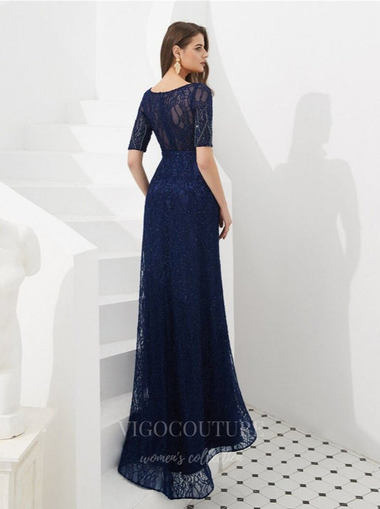 Vestido de fiesta de sirena azul marino con cuentas 20281