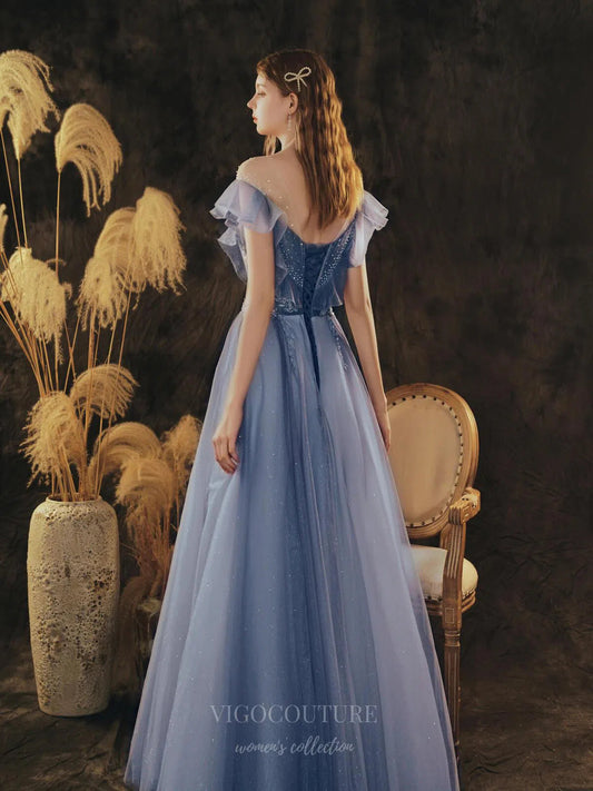 Vestidos de fiesta de tul azul marino brillante con mangas extralargas y cuello barco, vestidos de desfile SU066
