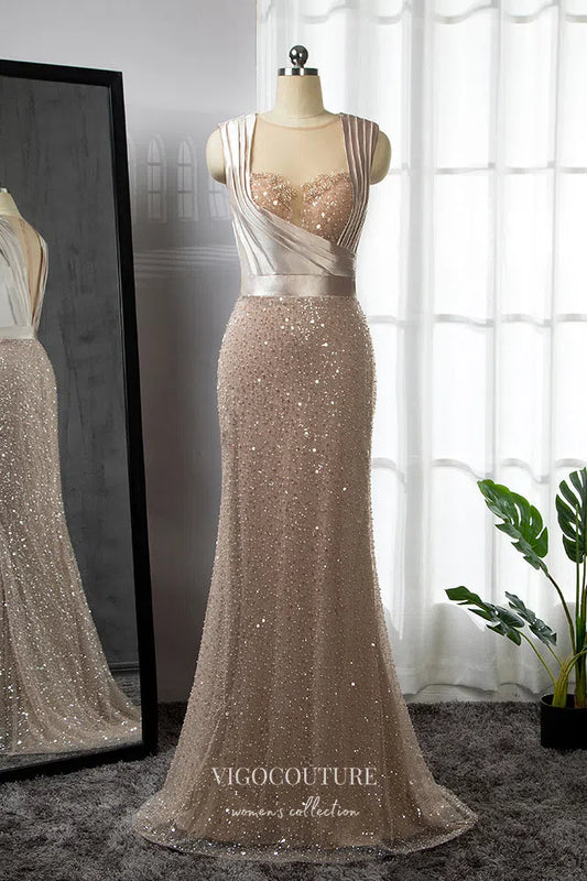 Vestidos de fiesta dorados de manga larga con cuentas y corte sirena 21300