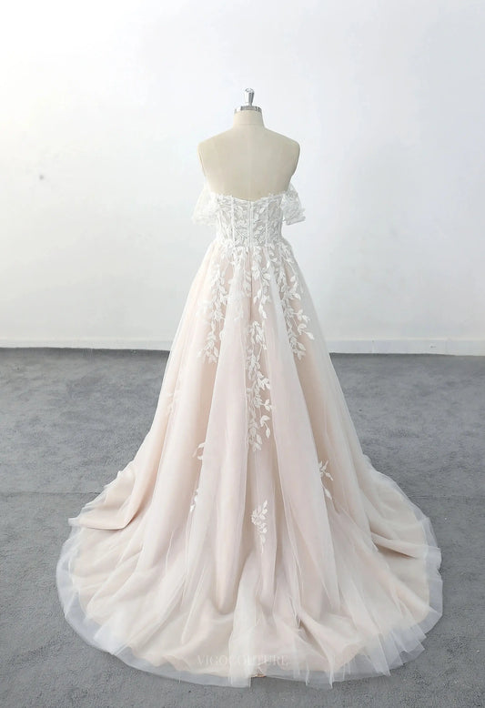 Elegante vestido de novia de encaje, corte A, hombros descubiertos y bordado floral | Estilo RD003