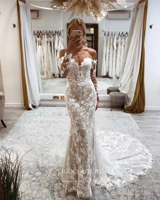 Vestidos de novia con apliques de encaje y manga larga, vestidos de novia con cola capilla W0060