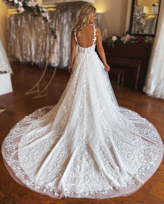 Vestidos de novia con escote en V y apliques de encaje, vestidos de novia con cola capilla W0056