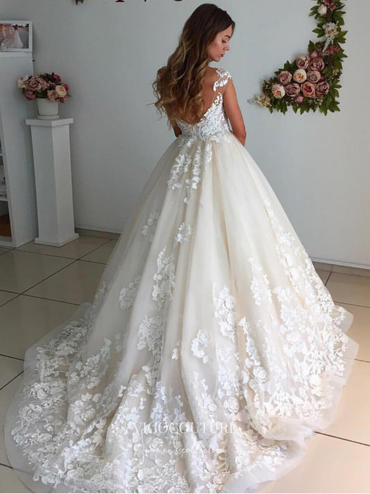 Vestidos de novia con escote en V y apliques de encaje, vestidos de novia con cola capilla W0069