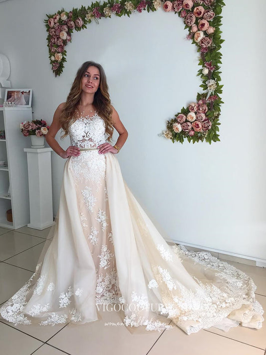 Vestidos de novia con apliques de encaje de sirena, vestidos de novia con cola capilla W0073