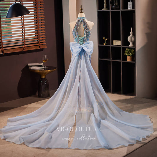 Vestido de fiesta de sirena con lentejuelas azules y cuello halter y lazo, 24406