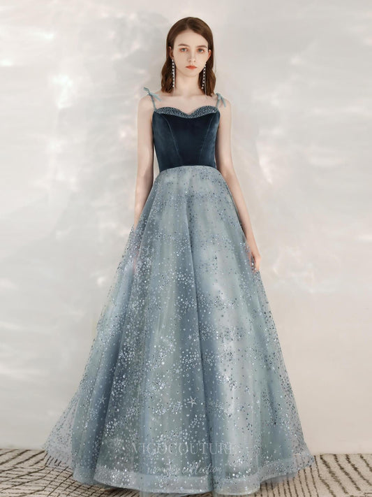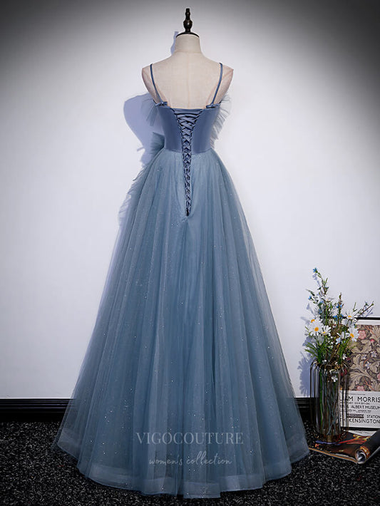 Vestido de fiesta de tul brillante con tirantes finos azules 20902
