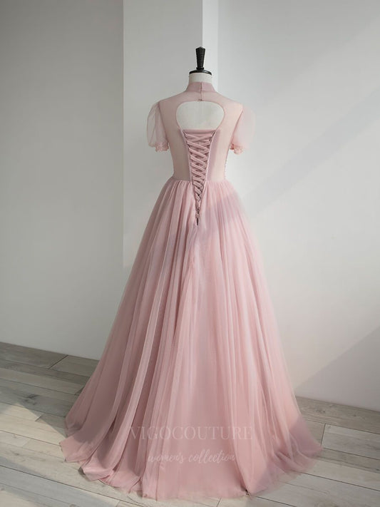 Vestido de fiesta de cuello alto con cuentas color rubor 20652