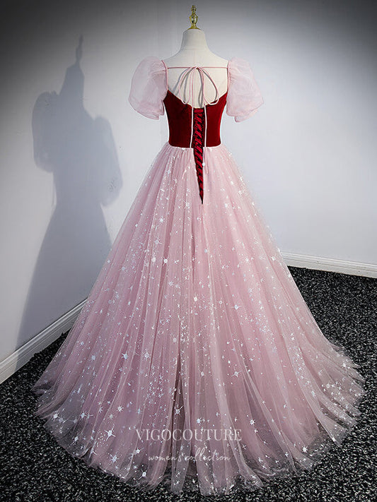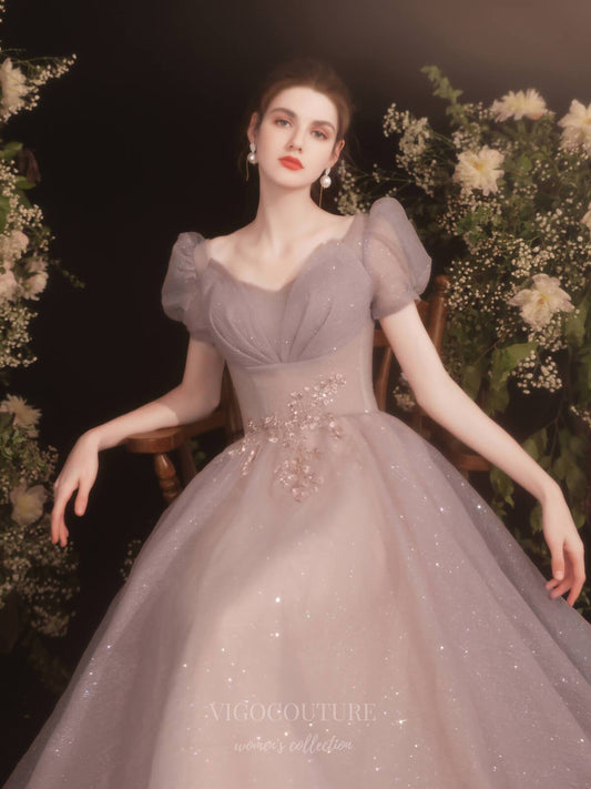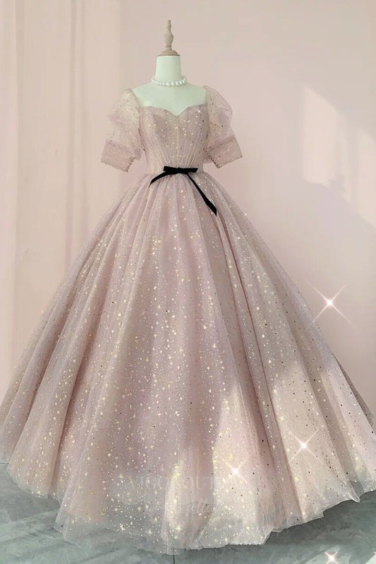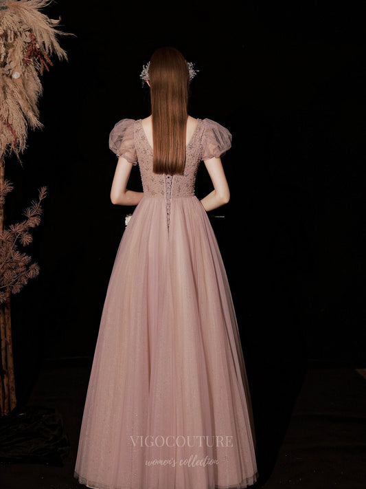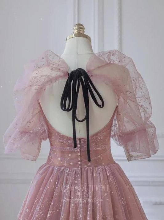Vestido de fiesta de tul brillante con mangas abullonadas color rubor 20728