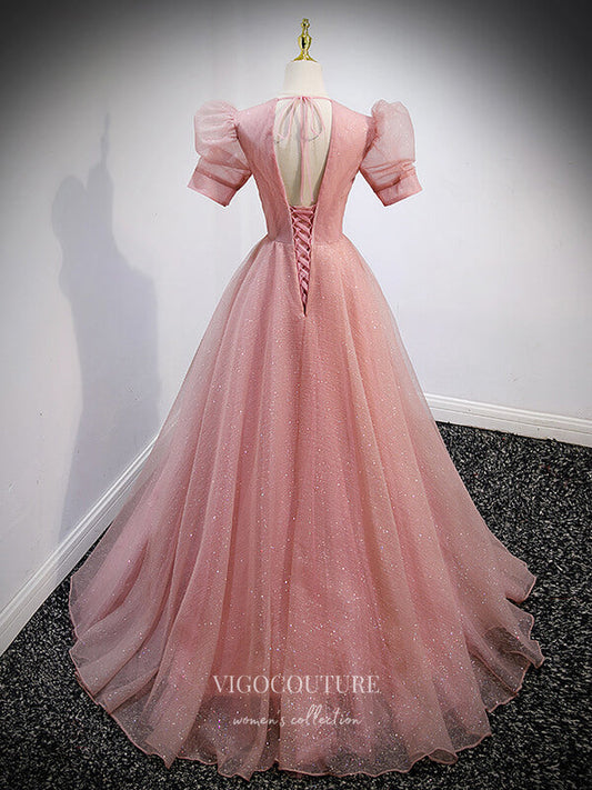 Vestido formal de tul brillante con mangas cortas para fiesta 21638