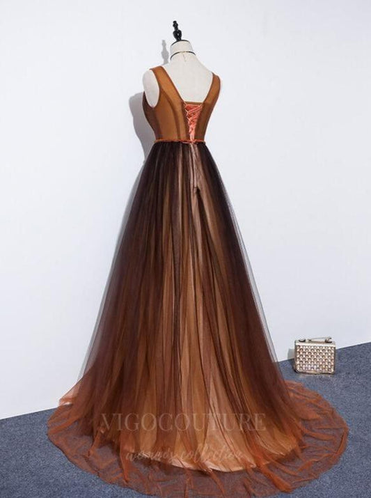 Vestidos de fiesta de tul marrón brillante con hombros descubiertos 21061