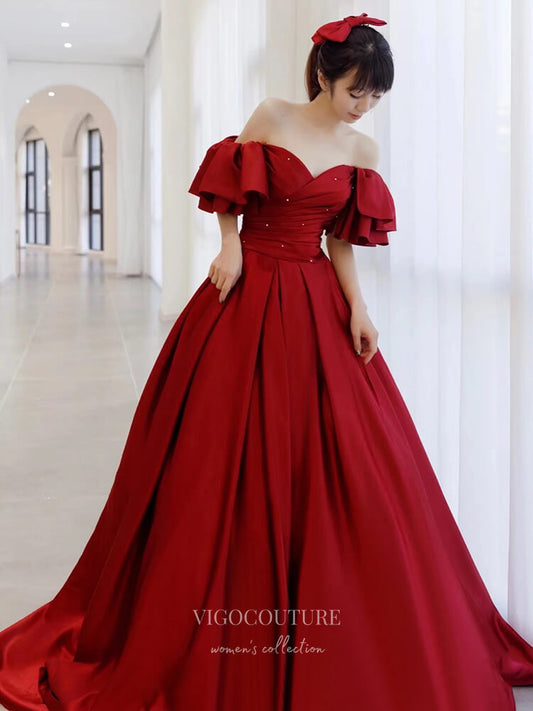 Vestido de fiesta de satén burdeos con hombros descubiertos, vestido formal 24411