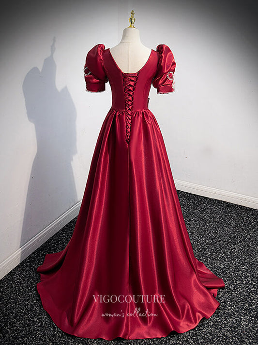 Vestido de fiesta de satén burdeos con mangas abullonadas y cordón de cuentas 21336