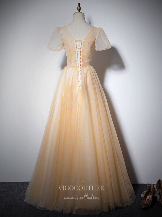 Vestido de fiesta de tul brillante color champán con escote en V 20721