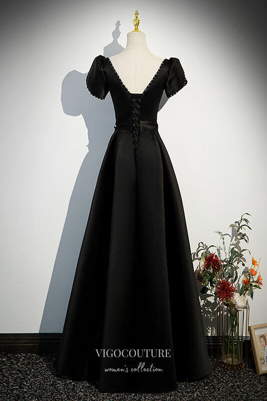 Elegante vestido de fiesta de satén negro con mangas abullonadas 22315