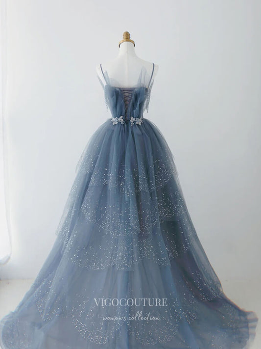 Vestidos de fiesta de tul con cuentas azules y tirantes finos 21032