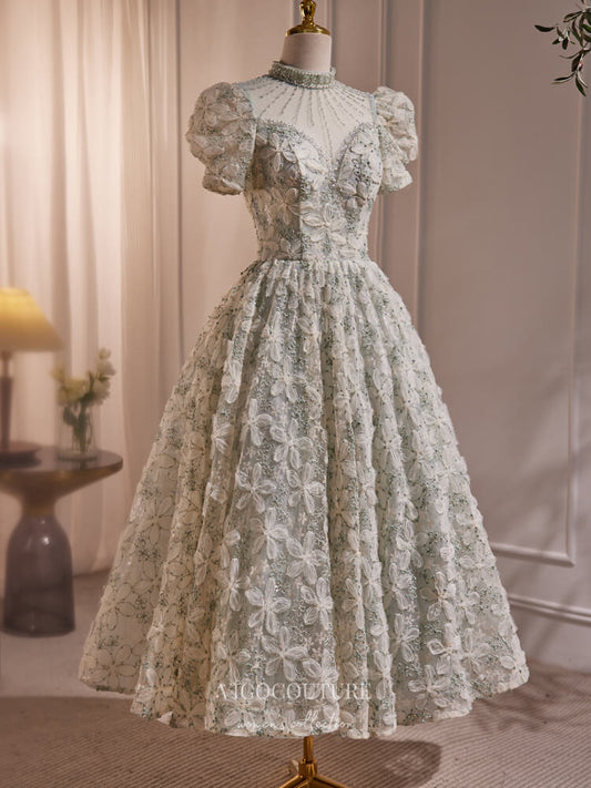 Vestido Hoco de encaje floral verde claro con mangas abullonadas y largo hasta la rodilla hc250