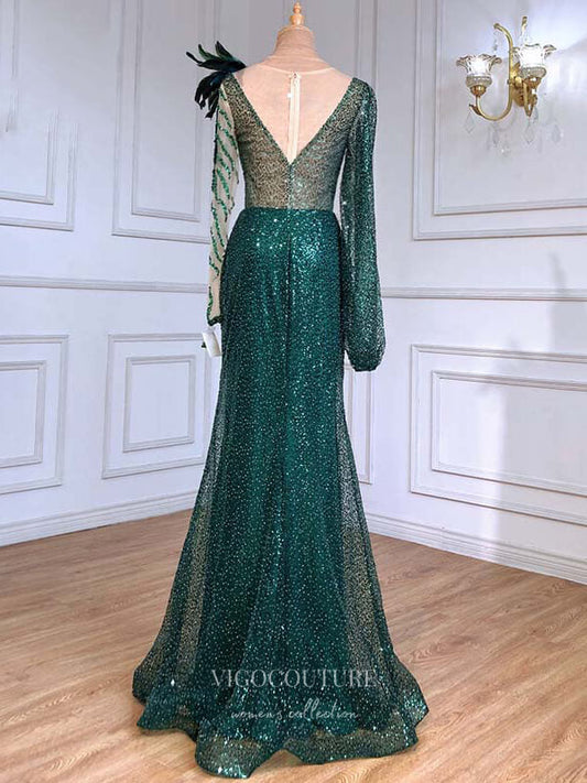 Vestido de fiesta de manga larga con cuentas y escote corazón con plumas 22067