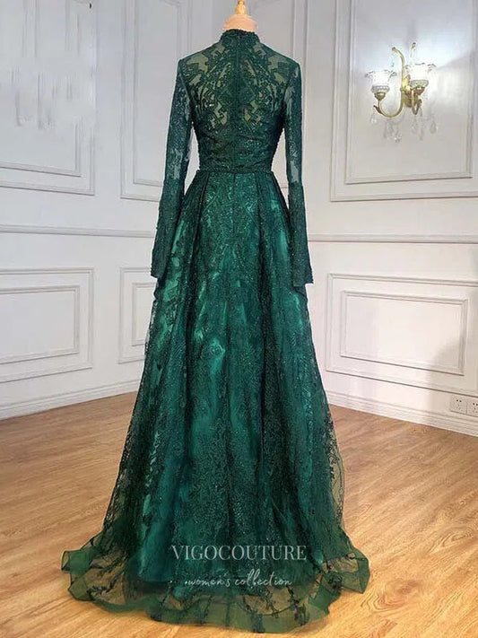 Vestido de fiesta de sirena con encaje y cuentas, manga larga y cuello alto, 24504