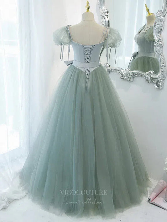 Vestido de fiesta de tul verde claro con mangas abullonadas 20877
