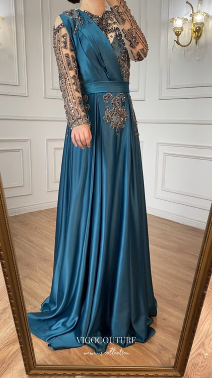 Vestido de fiesta de satén con cuentas y manga larga 21615