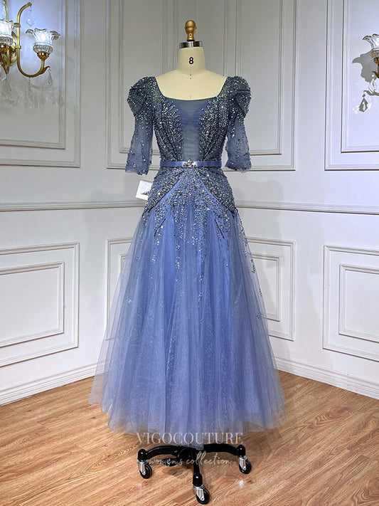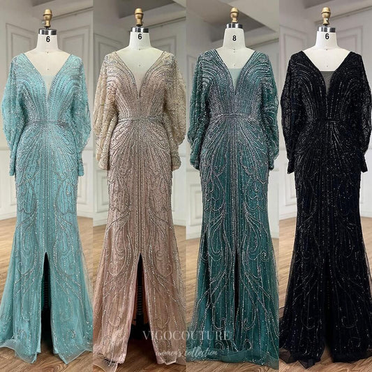 Vestidos formales de noche con escote en V pronunciado y cuentas, manga larga 21529