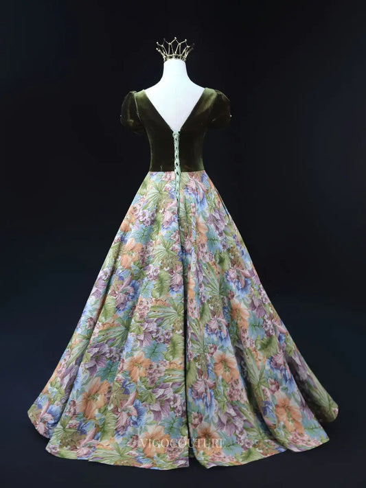Vestidos de fiesta de jacquard verde con mangas abullonadas y escote de terciopelo, vestidos formales florales SU063