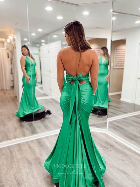 Vestidos de fiesta económicos de satén verde sirena con cuello halter y lazo 24068