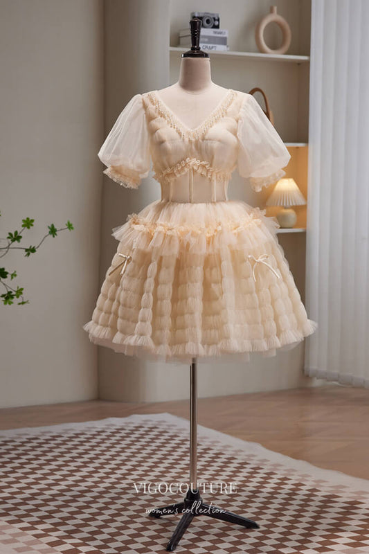 Champagne Lace Homecoming Dress with Plunging Neckline & Ruffled Tulle Hem – HC487